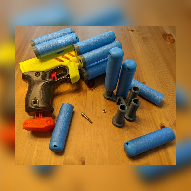 This picatinny rail mounted Nerf MegaXL dart holder was designed by Detroit Dartworks. It can fit on any picatinny rail but the 5ALVO MegaXL dart holder was designed originally to accompany the Meaker MkKnockout MXL blaster by MeakerArms. It will add a 5 MegaXL dart storage to the blaster, or any other you choose to mount it on.